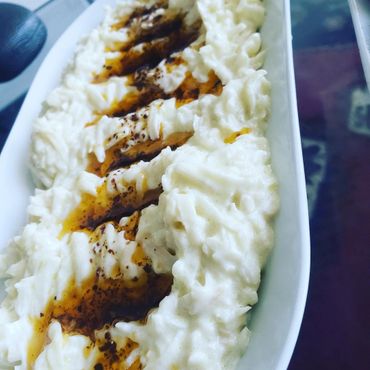 Thinly sliced grilled Doner Kebab over pita bread pieces and garlic yogurt mix. Topped with hot tomato sauce and browned butter.